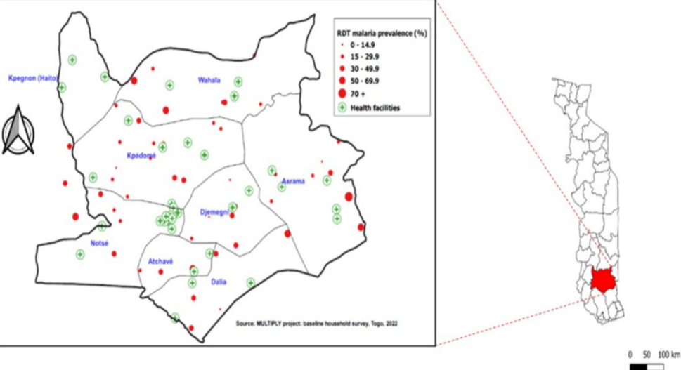 Background: Malaria remains the leading cause of mortality and morbidity in young children in sub-Saharan Africa. To prevent malaria in children living in moderate-to-high malaria transmission areas, the World Health Organization has recommended perennial malaria chemoprevention (PMC). Prior to piloting PMC implementation in southern Togo, a household survey was conducted to estimate malaria infection prevalence in children under 2 years of age (U2).
